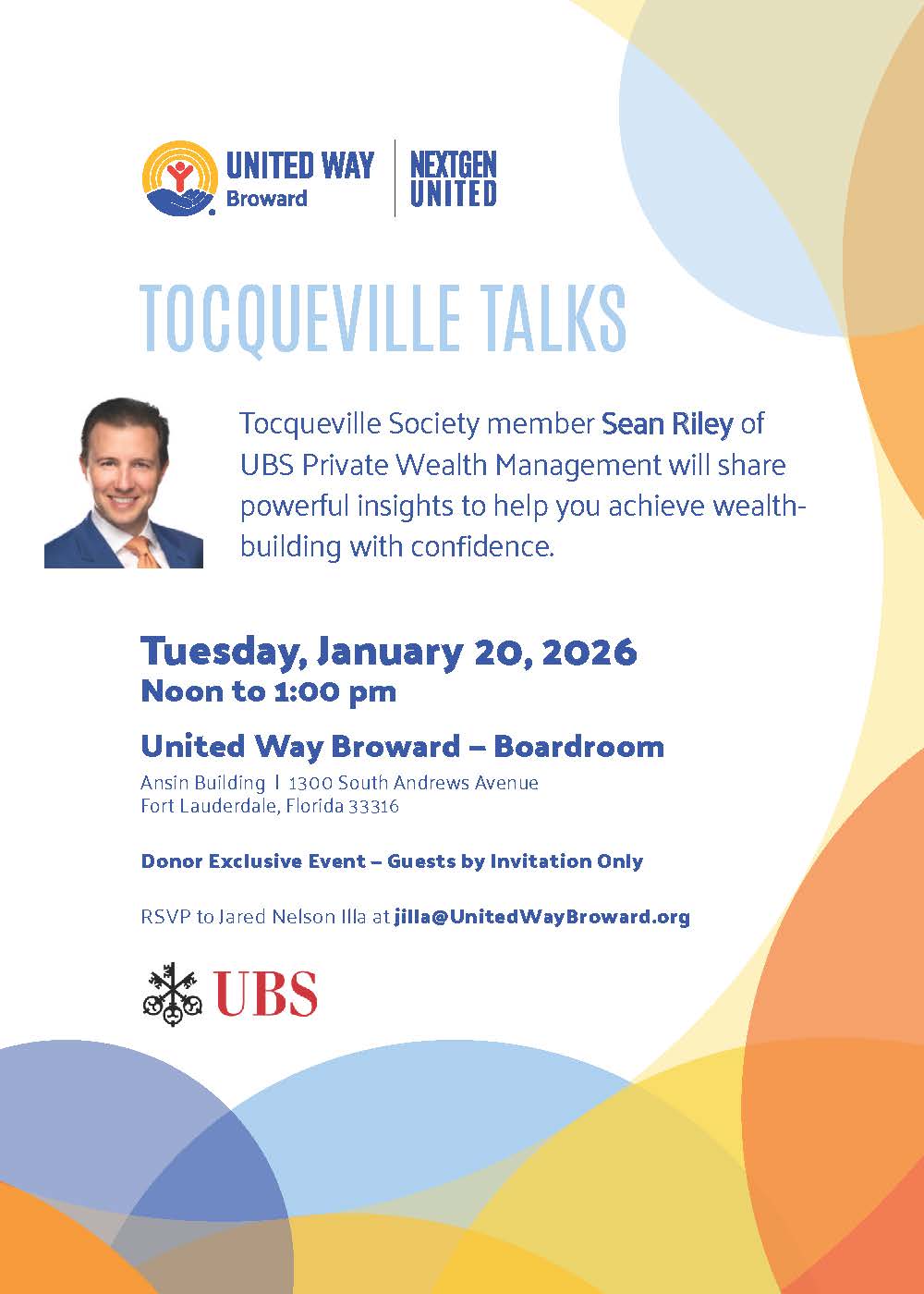 This special session will feature Tocqueville Society member Sean Riley of UBS Private Wealth Management, who will share powerful insights and practical strategies designed to help you approach wealth building with greater confidence and purpose. Drawing from his professional experience, Sean will offer guidance on long-term financial planning, smart decision-making, and developing a thoughtful approach to building and sustaining wealth.