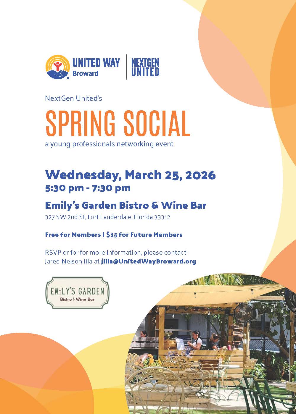 United Way Broward’s NextGen United invites emerging leaders from across Broward County to its Spring Social, an evening of purposeful connection and conversation at Emily’s Garden Bistro & Wine Bar. Whether you’re a current member or exploring involvement, this relaxed networking event will spark new relationships and deepen shared commitment to advancing community solutions.